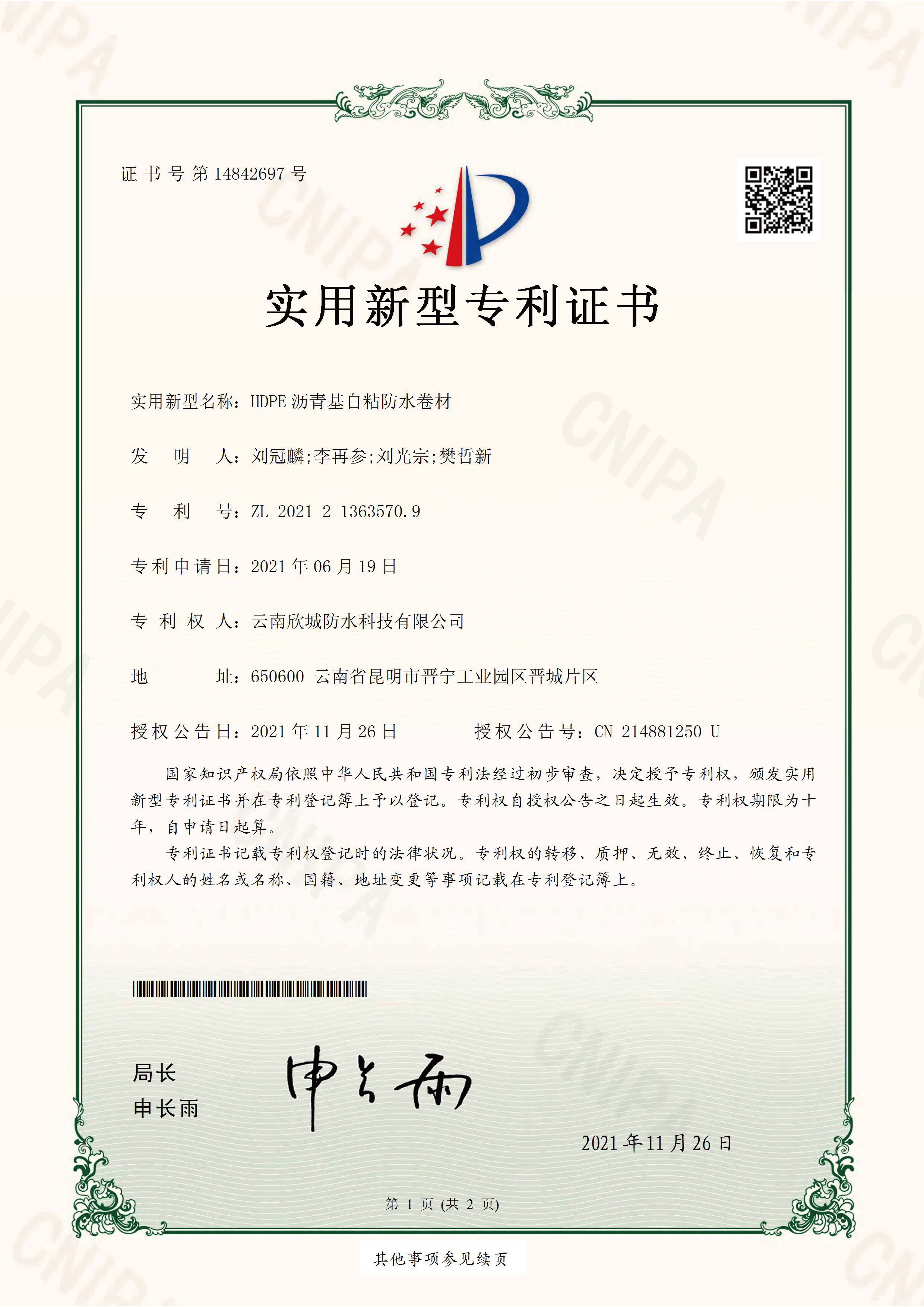 实用新型专利证书——HDPE沥青基自粘防水卷材