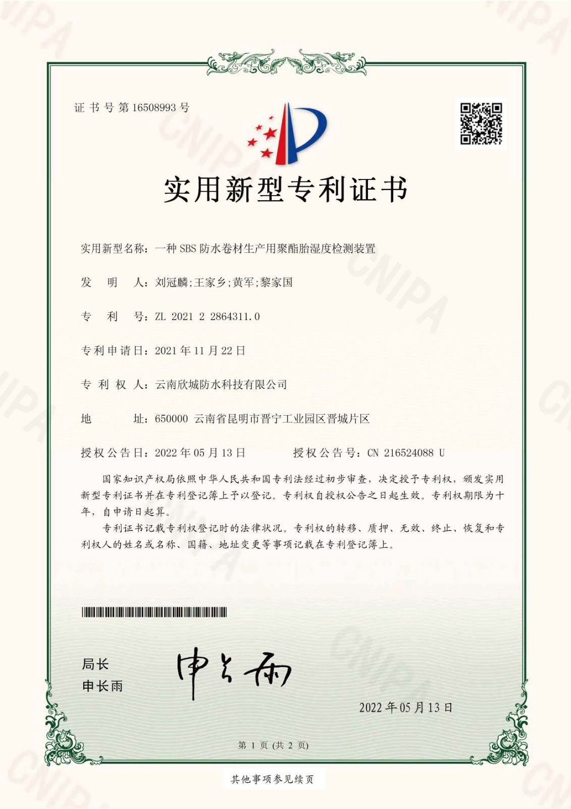 实用新型专利证书——一种SBS防水卷材生产用聚酯胎湿度检测装置