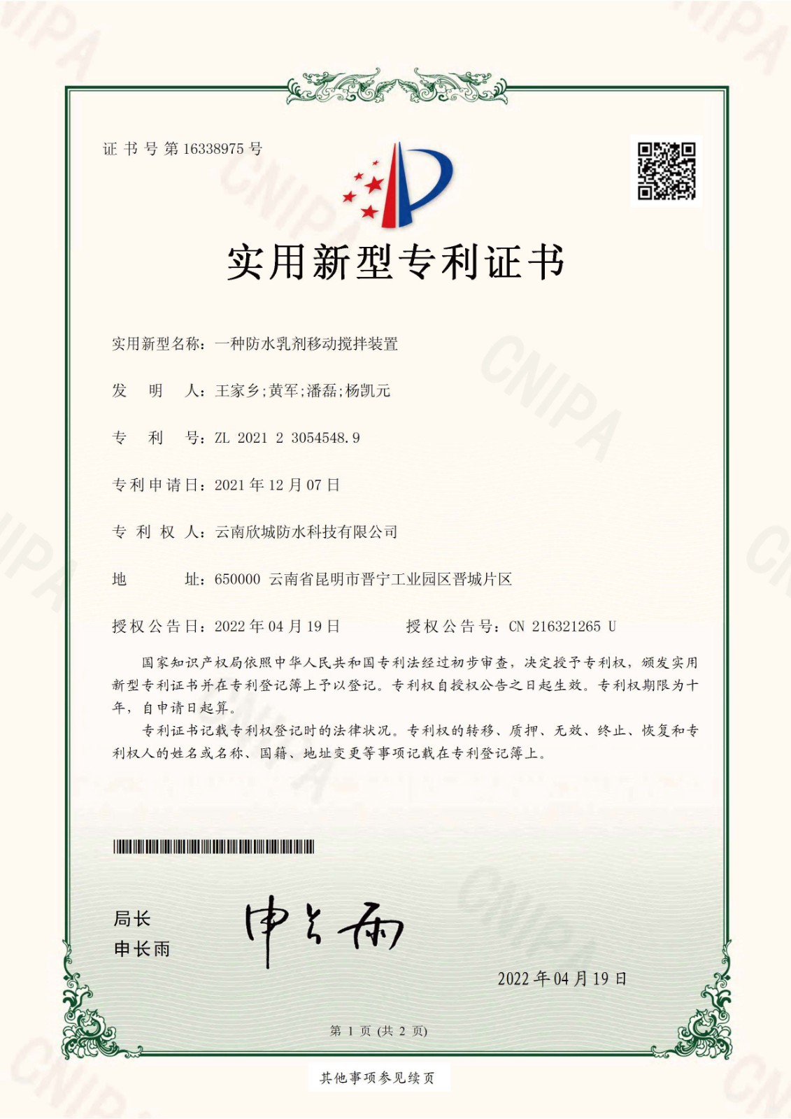 实用新型专利证书——一种防水乳剂移动搅拌装置