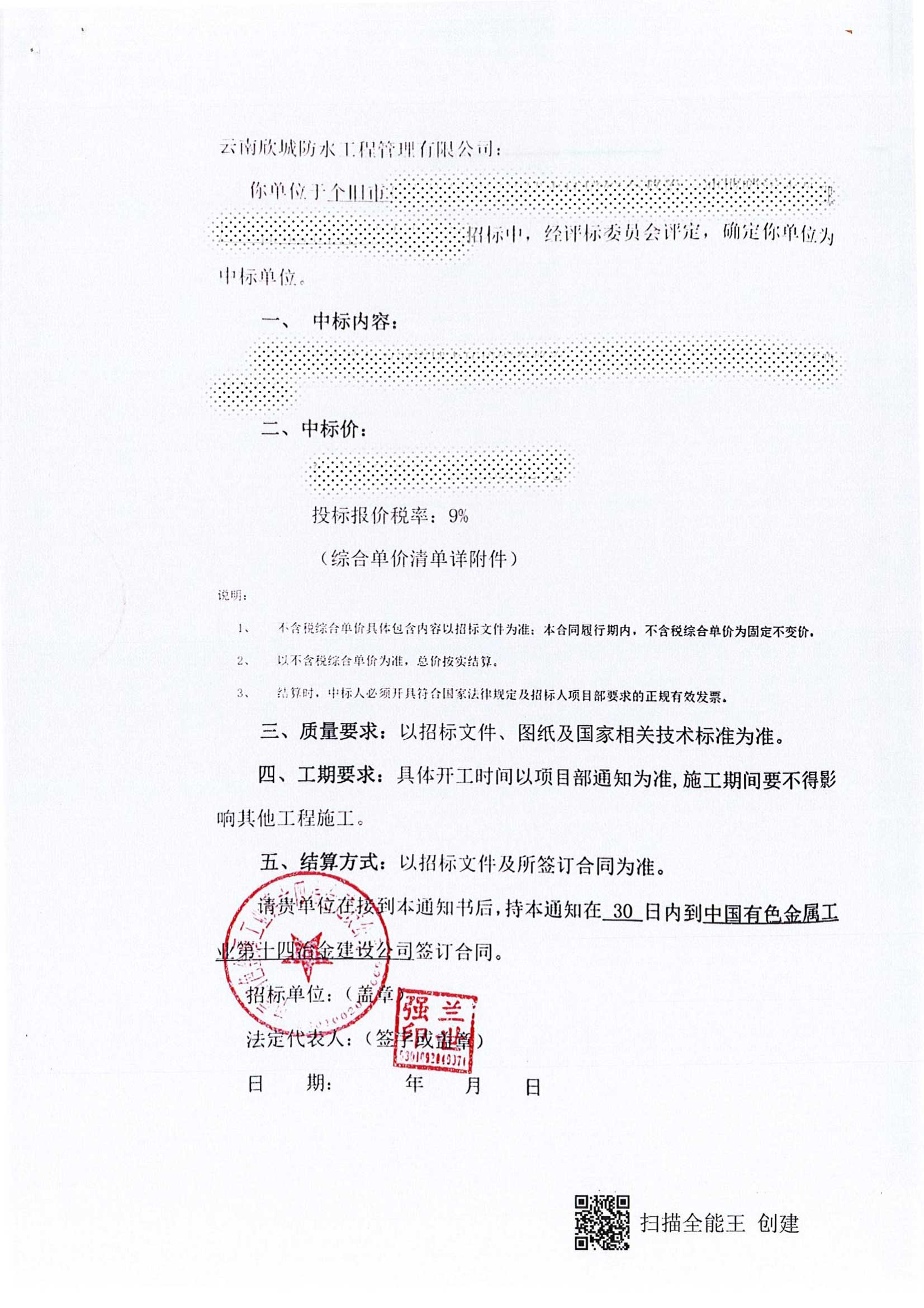 欣城中标个旧市鸡街倘甸双河流域水环境综合整治——冲坡哨污水处理厂工程HDPE防渗膜专业分包项目