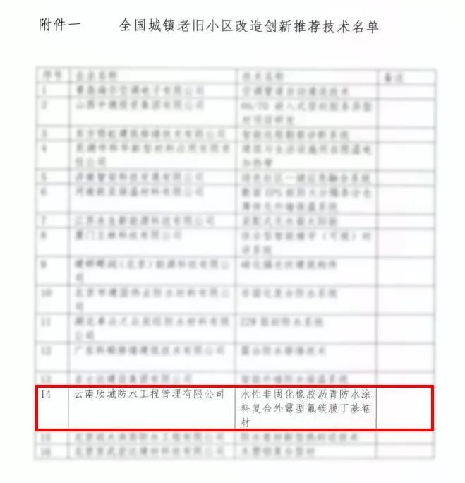 经专家评估论证,云南欣城防水(以下简称“欣城防水”)水性非固化橡胶沥青防水涂料、复合外露型氟碳膜丁基卷材光荣入选“全国城镇老旧小区改造创新推荐产品名单”。