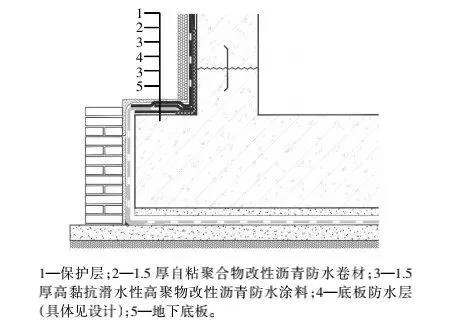 底板侧墙的接槎部位施工时,先将导墙顶部砖砌保护层拆除,露出甩槎部位并将其表面清理干净,然后将防水涂料涂刷在悬挑的底板基面上,待涂料干燥后采用热熔法将甩槎防水卷材反向粘贴在高粘抗滑涂层之上,并辊压排气保证卷材贴实;然后在悬挑底板及甩槎部位防水层上涂刷防水涂料,再铺设自粘聚合物改性沥青防水卷材,并与底板防水层搭接,搭接宽度≥150mm,最后在卷材上施工保护层,接槎部位具体构造如图2所示。