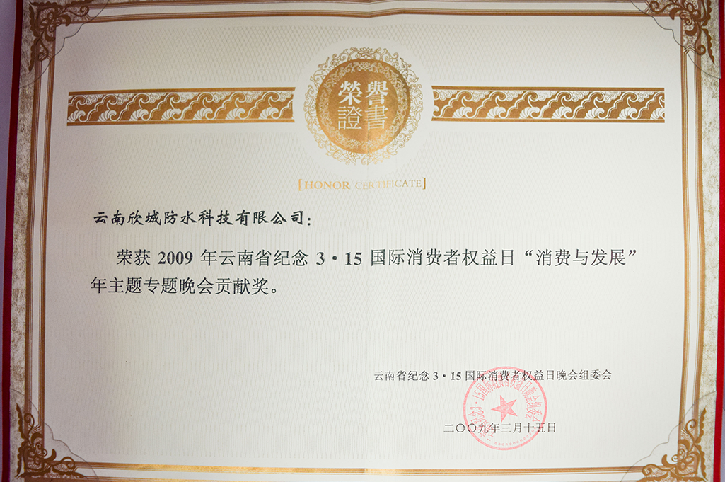 荣获2009年云南省纪念3·15国际消费者权益日“消费与发展”年主题专题晚会贡献奖