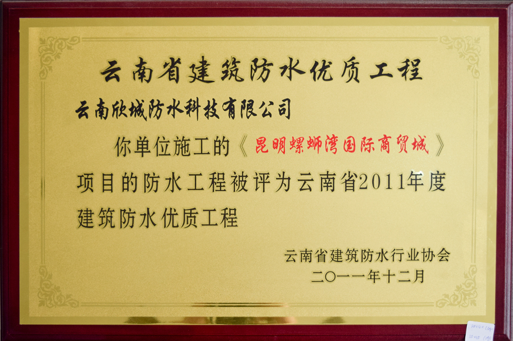 《昆明螺蛹湾国际商贸城项目的防水工程被评为云南省2011年度建筑防水优质工程