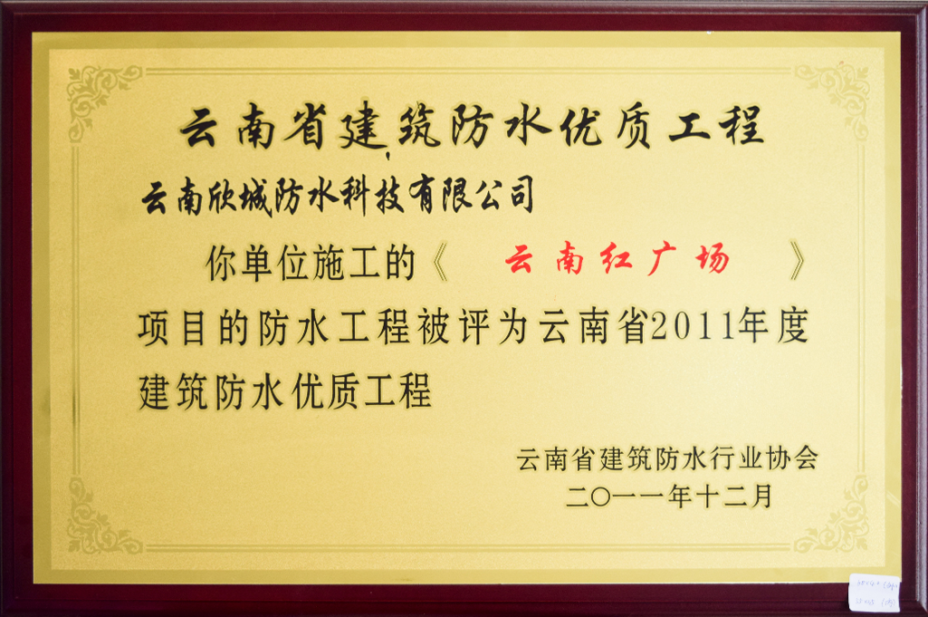 《云南红广场》项目的防水工程被评为云南省2011年度建筑防水优质工程
